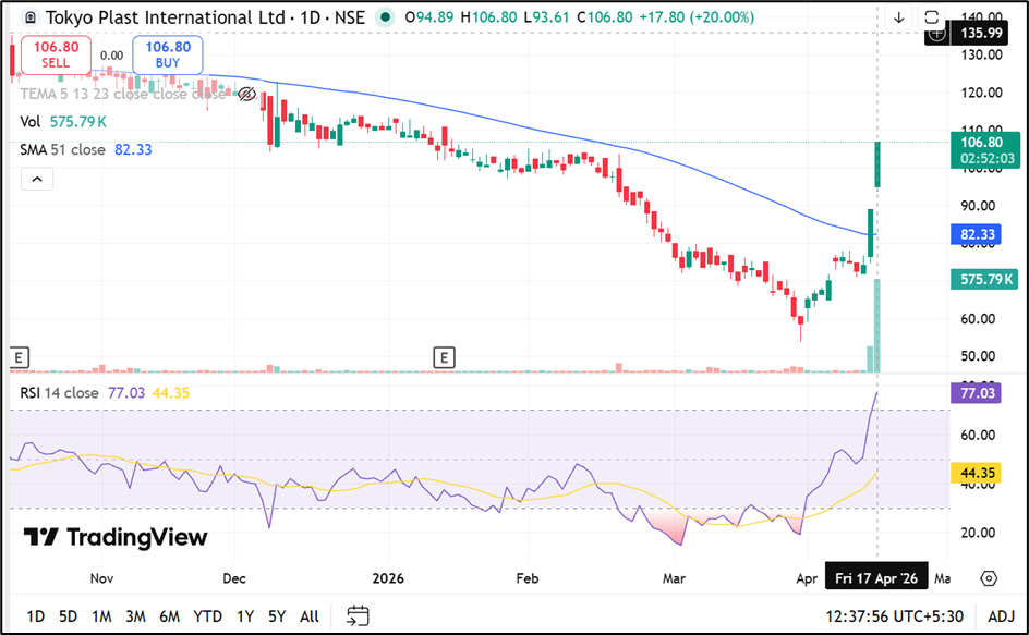 Tokyo Plast International Ltd. is trading near ₹106.80, up around 20.00%, and has moved sharply above the 50-day SMA near ₹82.33, with the 14-day RSI near 77.03 indicates overbought conditions, pointing to stretched momentum in the short term. Immediate support is placed in the ₹90.00–82.00 zone, while resistance is seen near the ₹115.00–125.00 range.