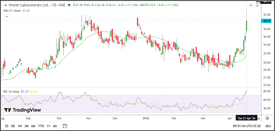 Vineet Laboratories is now trading comfortably above its 21-day Simple Moving Average of ₹31.62, which suggests that the near-term trend has strengthened considerably.