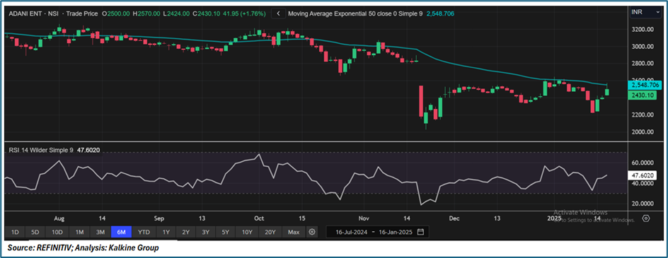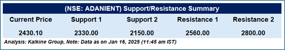 Adani Enterprises Ltd (NSE: ADANIENT) was trading at the current price of ₹2430.10 (as of 16 January 2025, 11:45 am IST), showing a bearish to neutral trend, trading below the 50-day EMA of ₹2548.71. The stock recently tested support at ₹2200, with ₹2400 serving as short-term support. The next key support is ₹2330, and a break below this could lead to further downside, potentially testing ₹2150. On the upside, ₹2560 is immediate resistance, followed by ₹2800. The RSI at 47.6 indicates neutral momentum, with a move above 50 signalling bullish potential. A breakout above ₹2560 could signal a trend reversal, while a drop below ₹2150 may result in further downside.