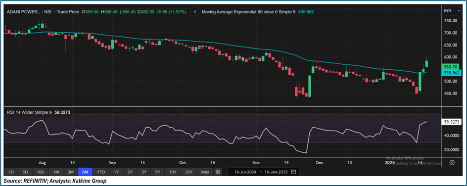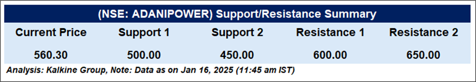 Adani Power Ltd (NSE: ADANIPOWER) was trading at the current price of ₹560.30 (as of 16 January 2025, 11:45 am IST), has recently broken above its 50-day EMA (₹535.56), signaling a potential shift to a bullish trend, with strong buying momentum reflected in recent price movements. Immediate support levels are at ₹535 (50-day EMA), ₹500 (psychological support), and ₹450 (tested in November-December). On the upside, resistance is found around ₹570–₹580, with critical levels at ₹600 and ₹650. The RSI stands at 59.3, indicating strengthening bullish momentum without being overbought yet. A sustained breakout above ₹580 could target ₹600 and beyond, while a drop below ₹535 could revisit lower support levels. Caution is advised as the stock approaches overbought conditions near ₹600.